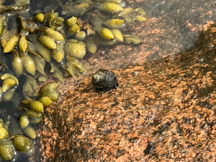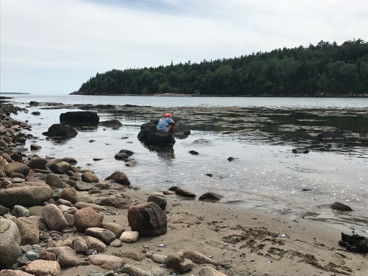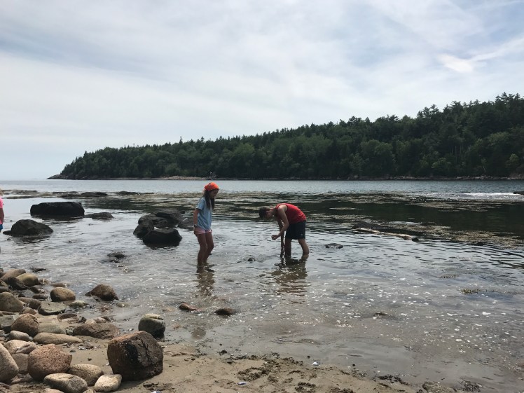Following Thunder Hole, we stopped for a picnic lunch, and then the highlight of the Loop Road, for us, was a stop at the rocky but protected ocean beach at Otter Cove. The girls had a blast and could have stayed there all day. First, they discovered how cold the ocean is up Downeast in Maine. Both girls had a blast seeing how much wildlife they could find in the cove — they found bunches of snails, and then a friendly boy taught them how to find and pick up crabs. The girls were excited to discover that crabs really do walk sideways!