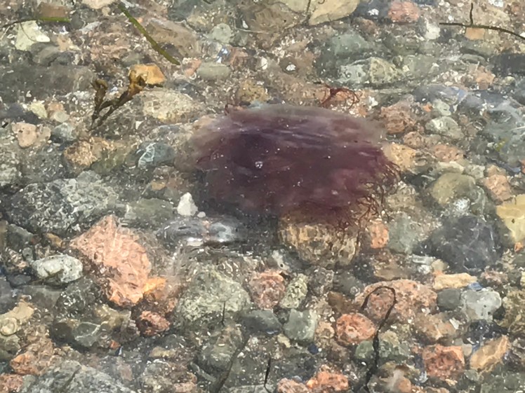 Watching them on the coast, learning and discovering by doing, was, for me, proof positive that our go-with-the-flow approach to using the world to inspire their curiosity is likely to be a successful approach to education this year. Yes, we'll make use of the math books, but these days we carry the world at our fingertips — all we need to do is to find something to inspire us to learn about what's out there: pick up some crabs and then read about crabs, spot some jellyfish in the cold Maine water, and then ask the rangers and poke around online to figure out what that giant purple tinged jellyfish might have been. As Elizabeth said, "The Maine ocean is so much more INTERESTING than the New Jersey ocean." I tried to point out that it's not more interesting, just differently interesting, but Elizabeth didn't quite agree that watching the human "wildlife" at a Jersey shore boardwalk is quite as interesting as exploring tidal life along the Maine shore.