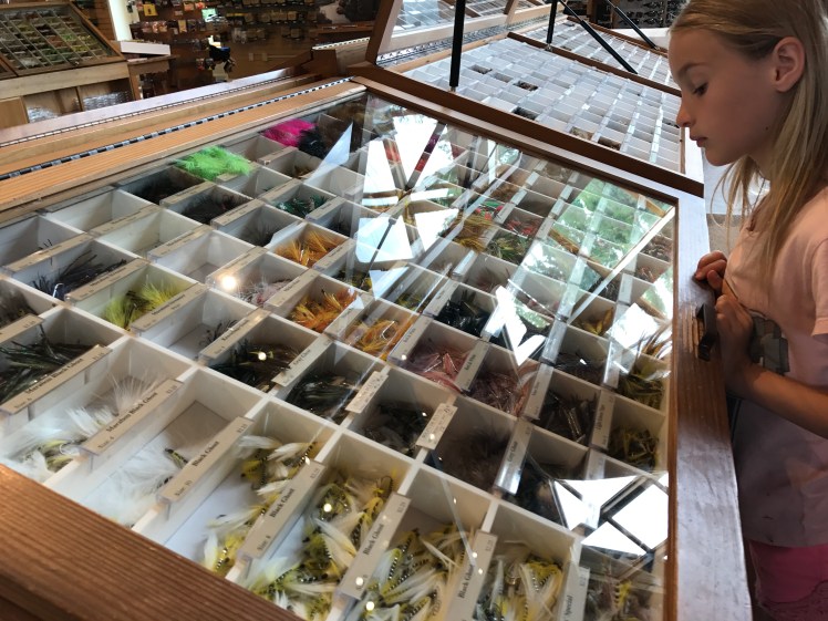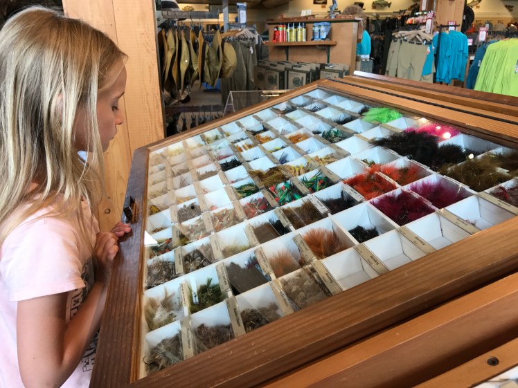 Julie discovering that Beans sells kits and materials for tying one's own flies.
