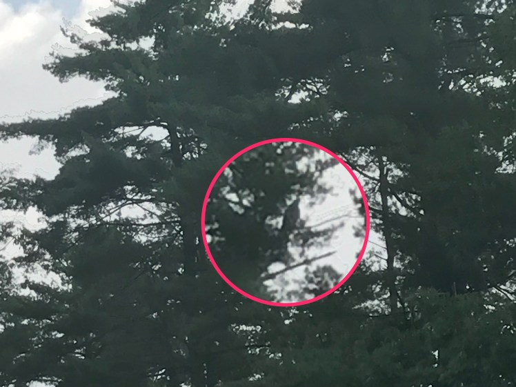 One of the eagles (I think they were golden eagles, as even on the adults I didn't see the white head of a bald eagle, and these were full-grown nesting adults) near its nest in the tree in our yard.