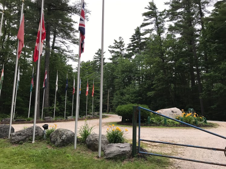 Seeds of Peace entrance with flags of the many nations represented there — the flags stay outside at the entrance.
