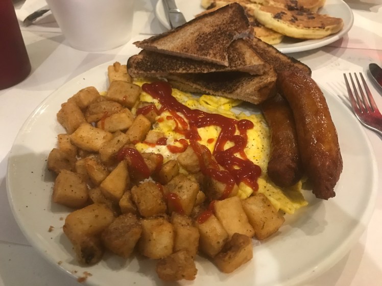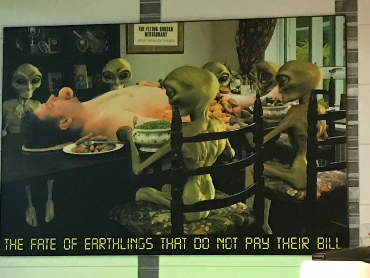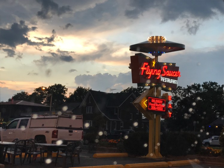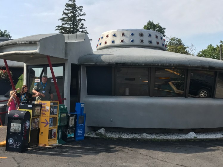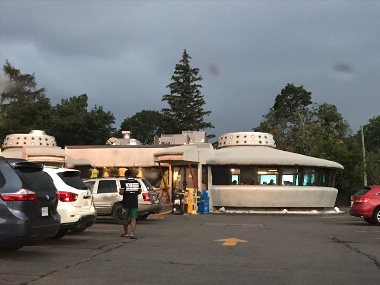 Last night, when I couldn't face another TGIFriday's style dinner, I made use of THE GOOGLE and found Thrillist's article Places to Eat in Niagara Falls That Don't Suck. So far, Thrillist hasn't steered us wrong. Last night we had delicious Greek food at Koutouki and now we've been abducted by aliens for breakfast at the Flying Saucer.