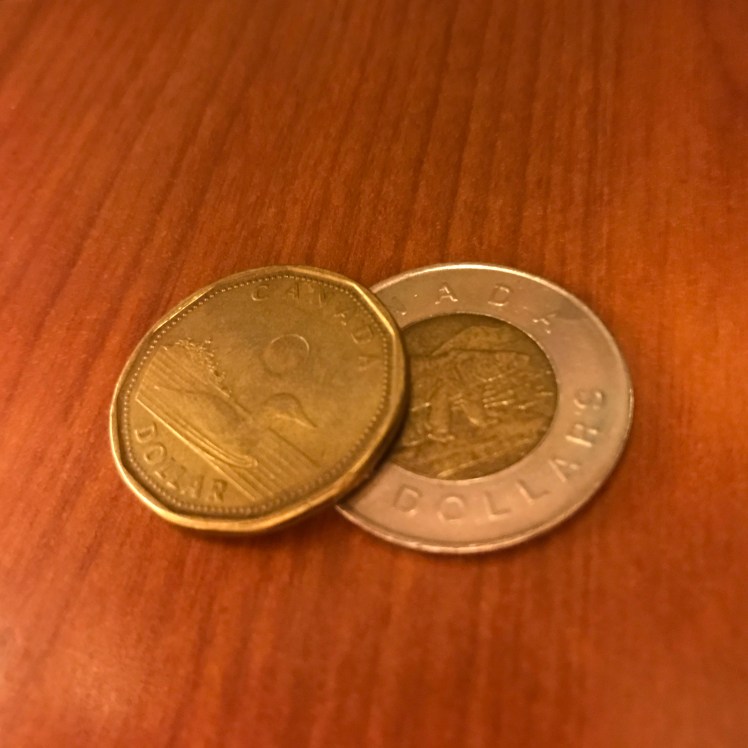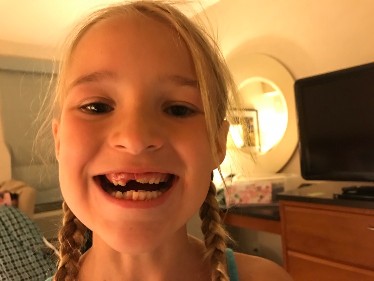 Julie lost her front tooth the night we arrived in Canada. The Canadian Tooth Fairy came — or so we guess from the fact that s/he left Julie Loonies and Twonies, as s/he didn't respond to Julie's note.