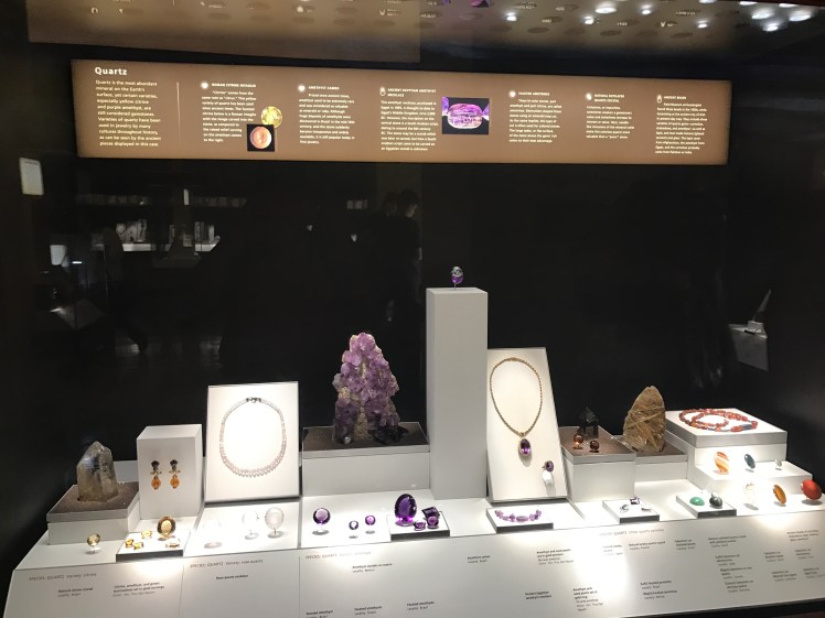 The Ancient Americas exhibit was really interesting and I learned in more detail about the hunters and gatherers that were our predecessors. There were lots of artifacts to look at including, but not limited to, jewelry, pots and ceramics, weaponry, and, tools. The hunter/gatherer game was a big hit for Parker and me (Candy and my mom had to almost literally drag us out of there). We also went to the gemstone exhibit (not the Hall of Jades) and saw a lot of pretty and cool stones. My favorite was the yellow sapphires and Julie liked the pink sapphires. We got to see the sapphires (my and my sister’s birthstone), amber, a jade hilted dagger, and so much more. When Julie saw the diamonds she said,