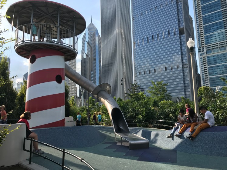 So, Maggie Daley playground has a couple of different parts. There’s a couple of fountains to play in, and an area just for younger kids that we didn’t really explore. There is also the Enchanted Forest, which was cool. It’s made of a bunch of bushes and hedges, mostly with fountains, logs to jump across, talking tubes, and a mirror maze. I enjoyed the logs and mirror maze the most.