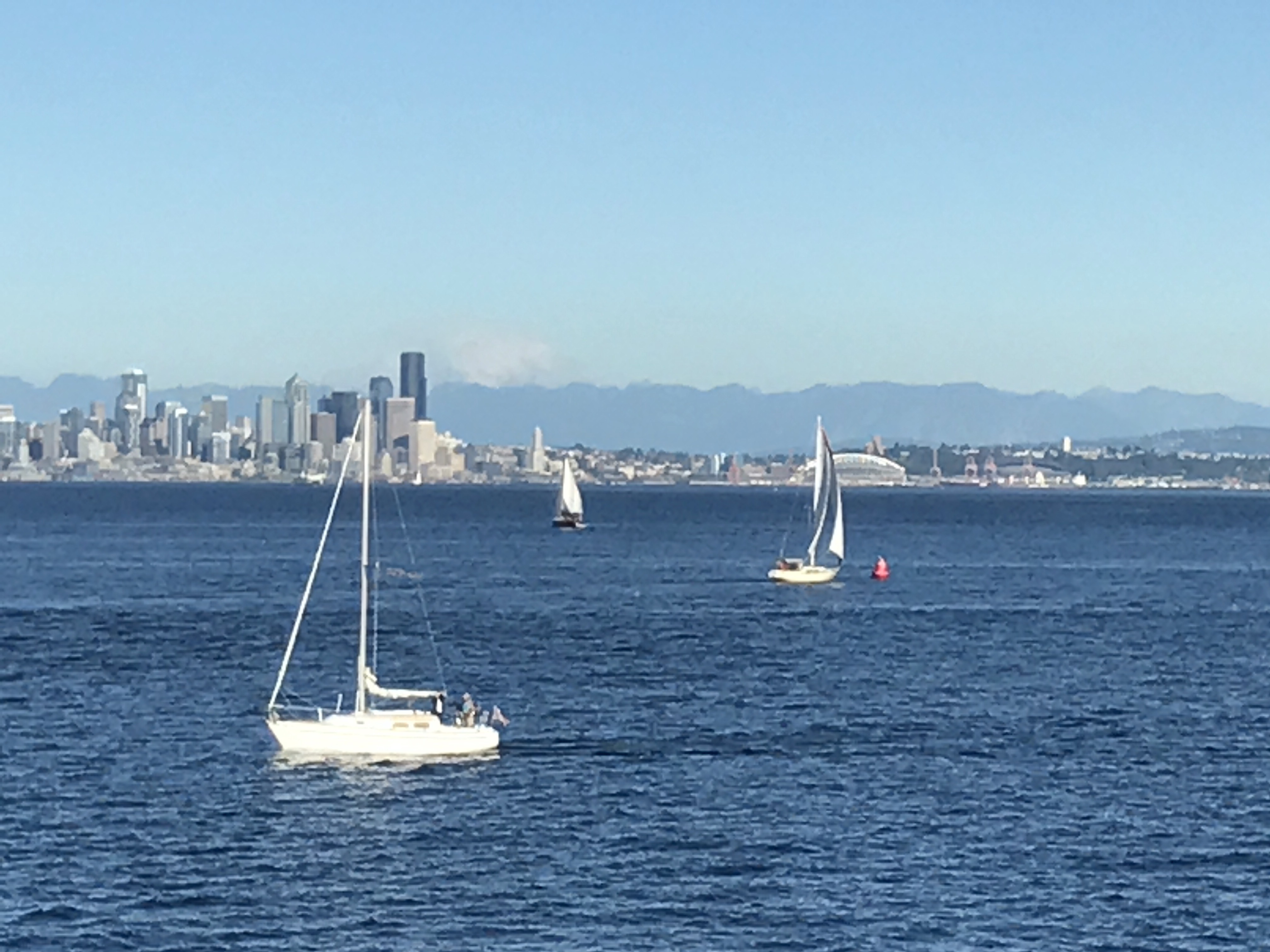 Wildfires and their smoke and ash in the Pacific Northwest, including fires visible from Puget Sound looking past the Seattle skyline: