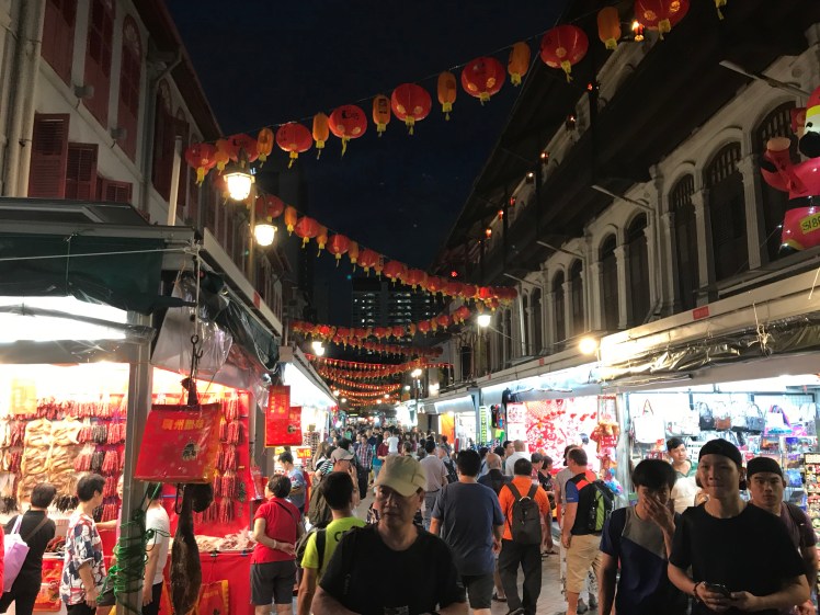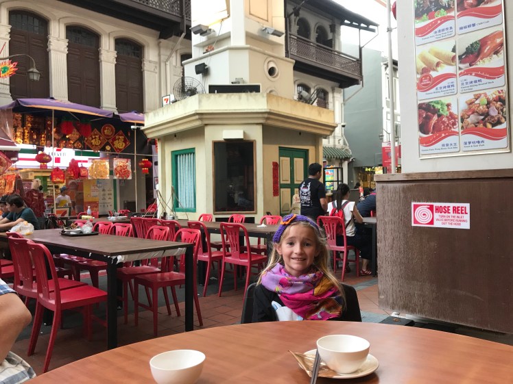 Our first night in Singapore, we ventured out for Chinese food in Chinatown. We ordered Peking Duck and I am still dreaming about it, as the crispy duck skin was one of the most delicious things I’ve ever eaten. Fortunately for Mike and me, the girls are horrified by the idea of eating duck, so we didn’t need to share. More for us! We wandered around a little bit that night but headed back fairly early to settle in to our bizarre sleeping arrangements.